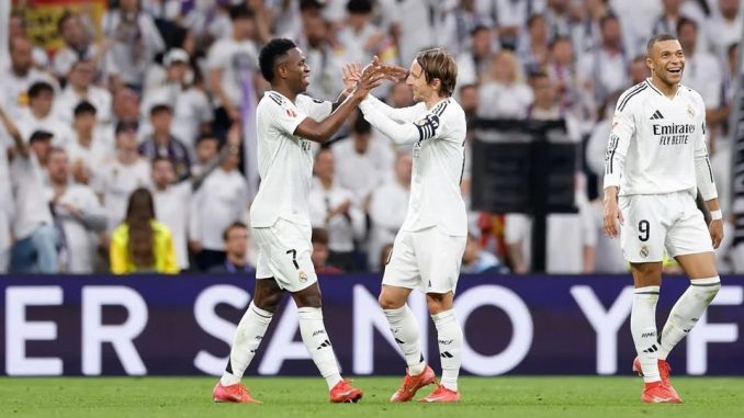 El Real Madrid no cede en la pugna con Barcelona y Atlético por el título de Liga. Los de Ancelotti ganaron al Girona y cerraron una gran semana en el Bernabéu, en la que el miércoles se clasificaron para octavos de la Champions tras vencer con autoridad al Manchester City. El capitán Modrić abrió el marcador al filo del descanso con un gol de bandera desde 25 metros y Vini Jr. certificó el triunfo en el 83’ tras asistencia de Mbappé. Tres puntos importantes que dejan el campeonato en un puño, con nuestro equipo y el Barcelona empatados y el Atlético a un punto de distancia.