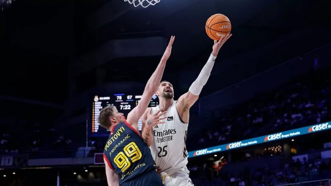 El Real Madrid logró su 11º triunfo seguido en la Liga. A pesar de estar inmerso en plena lucha por el playoff de la Euroliga, donde afrontará la próxima semana una doble jornada decisiva ante Olympiacos y Fenerbahce, nuestro equipo cambió el chip para derrotar al MoraBanc Andorra en el Movistar Arena y seguir firme en el liderato de la Liga. Un partido en el que fue de menos a más, remontando 18 puntos al descanso y encarrilándolo en el tercer cuarto tras un parcial de 63-30 en 21 minutos. Len (17 puntos y 25 de valoración), Feliz (13 y 21) y Tavares (12 y 18), fueron los más destacados de los de Scariolo, que dio descanso a Maledon, Abalde y Lyles.
